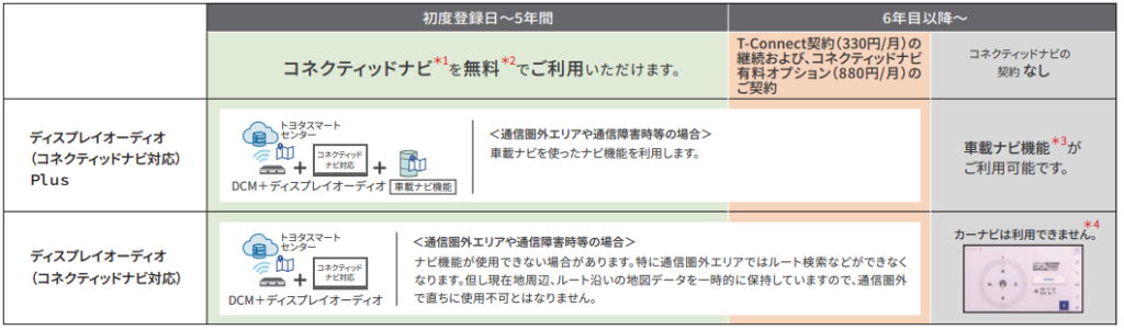 オンラインナビゲーションの利用には、トヨタのT-Connect(初回5年間は利用無料、以降T-Connect利用継続契約(330円/月)および、コネクティッドナビ 有料オプション(880円/月))を契約し、ネットを介して地図を見たり、ルート案内などを行う必要があります。